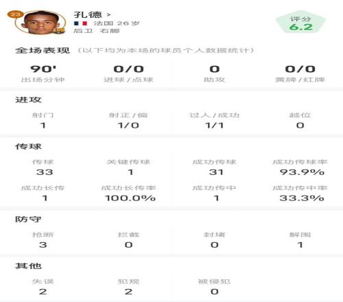 传球:33次传球,31次成功,传球成功率93.9%;1次关键传球,1次成功长传,1次成功传中