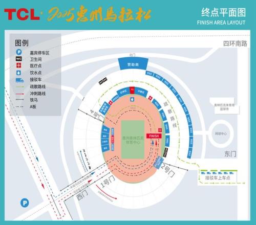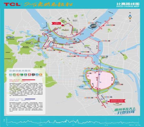 马拉松:惠州体育馆(云山西路) → 云山西路 → 市民乐园东路 → 惠州大道 → 东江大桥辅道 → 东江三路 → 鹅城大桥之夜(折返) → 东江三路 → 东江二路 → 东江一路→水北六路 → 文昌一路 → 云山西路 → 惠州大桥 → 环城西路 → 塘尾街 → 水门路 → 中山南路 → 中山东路 → 东新桥 → 下塘街 → 新建路 → 滨江东路 → 新开河北桥 → 览江南路(折返) → 览江南路 → 新开河大桥 → 环岛二路 → 环岛一路 → 东湖路 → 永平路 → 新建路 → 桥东路 → 水门大桥 → 惠沙堤一路 → 惠沙堤二路 → 金山大道 → 金山一桥 → 金山大道辅路 → 瞰湖三路 → 湖畔南路 → 瞰湖一路 → 瞰湖二路 → 金山大道辅路 → 金山二桥 → 金山大道 →金山大道南段(折返) → 惠州奥林匹克体育场(终点)