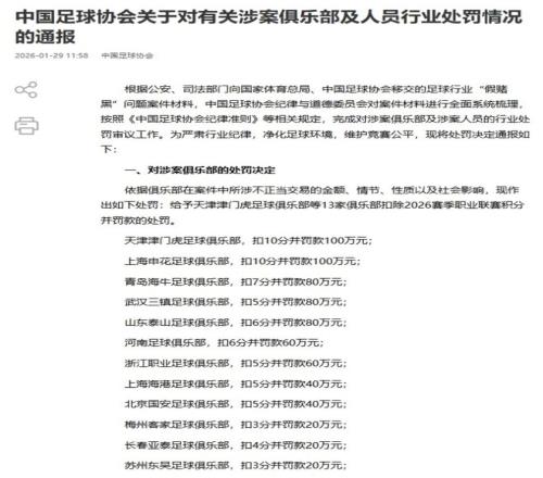 北京时间1月29日,中国足协公布“假赌黑”专项整治行动处罚结果,球员方面,包括李铁、陈戌源在内,一共73人被终身禁足。俱乐部方面,中超、中甲,累计13家俱乐部遭扣分+罚款处罚,其中新赛季的4大争冠球队也没能幸免,全部被扣分。仅蓉城队没有卷入其中。
